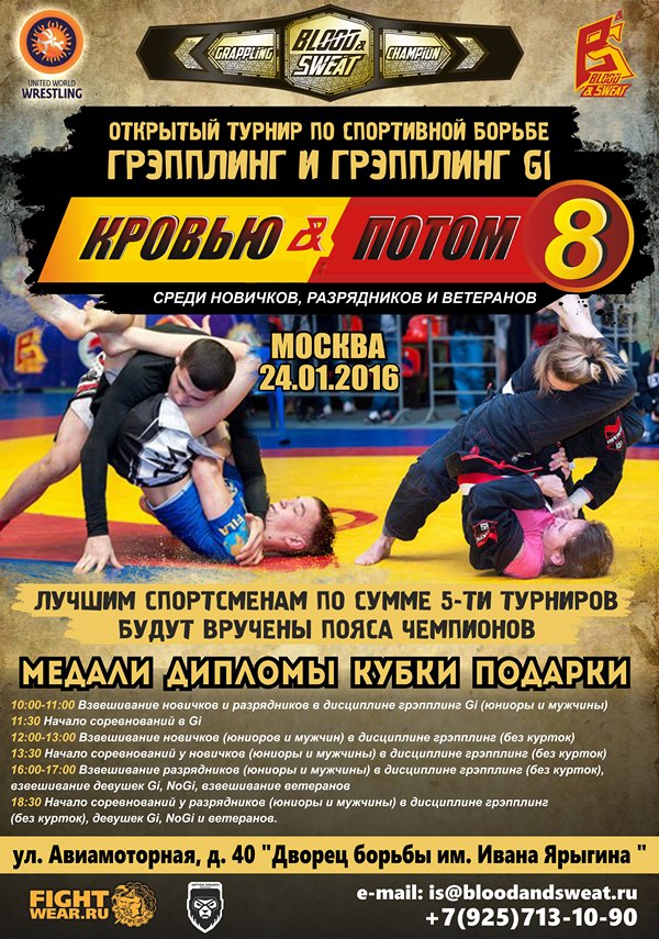 Восьмой турнир по грэпплингу UWW «Кровью и потом» состоится 24 января в Москве и пройдет во дворце борьбы имени Ивана Ярыгина по адресу г. Москва, ул. Авиамоторная, 40.